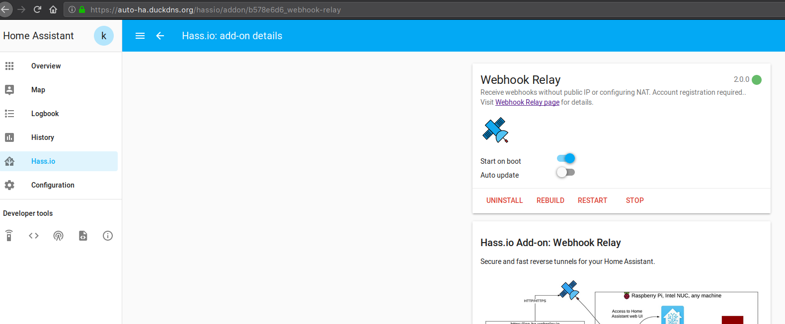 - Check the logs of the “Webhook Relay” add-on to see if everything went well. It should print out your public URL.